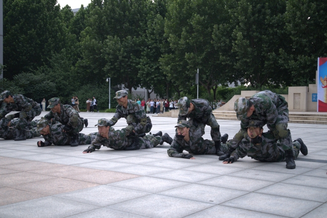 从转体到正步,摆臂、踢腿、齐正步互换,每一个动作都行云流水,整齐有序的队列,彰显出团结的力量;直拳横踢、抱腿顶摔,从擒敌到格斗,每一次出击都锐不可当;横刀立马、剑指长天,从日常训练到汇报表演,每一滴汗水都体现出国旗护卫队对国旗的尊重与热爱。一身戎装显风采,英姿飒爽少年郎。一系列熟练动作的背后,是国旗护卫队每位队员汗流浃背和咬牙坚持的努力。