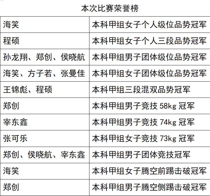7月6日至9日,河南省第十四届运动会学生组武术比赛暨河南省第十八届学生武术比赛大学生组比赛在河南大学举行,来自全省53支代表队的417名运动员参加比赛。经过近5天的激烈角逐,beat365武术队张家旗获得男子本科甲组太极器械项目第三名、男子本科甲组其他太极拳第四名,刘正阳获得男子本科甲组24式、42式太极拳项目第四名,常棋棋获得女子本科甲组二类拳第四名、女子本科甲组传统器械第五名,侯嘉琪获得女子本科甲组初级三路长拳第七名、女子本科甲组初级剑第八名,张梓琦获得男子本科甲组其他太极拳第八名的优秀成绩。周为同学获得“优秀运动员”称号,指导教师毛璐璐被评为“优秀教练员”。