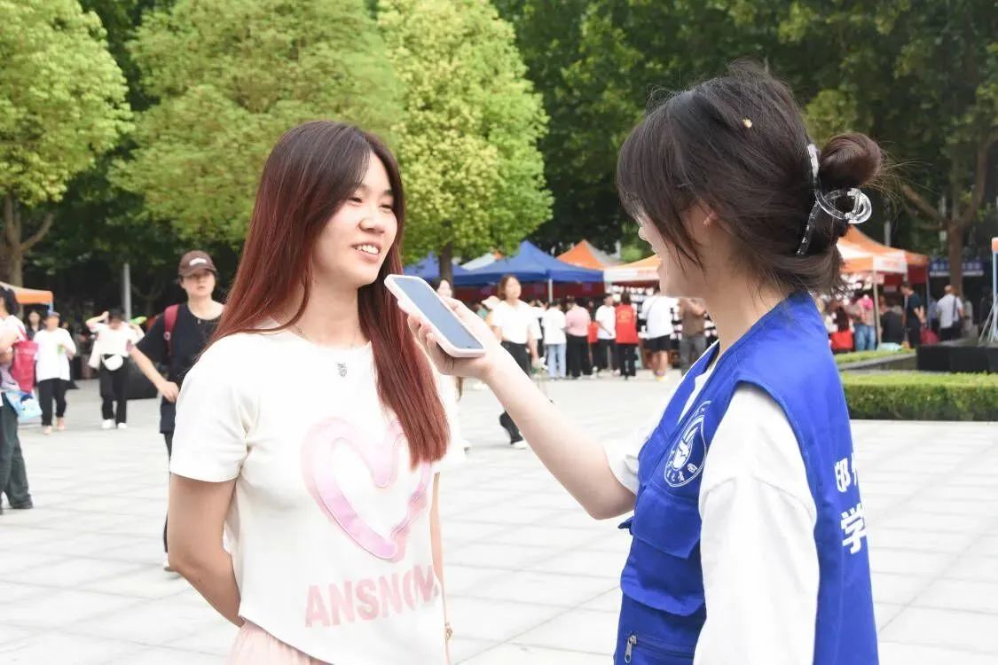 来自校卫队的志愿者韩冰茹是商学院的一名大二学生,她身穿红马甲,手持校园地图穿梭在迎新“第一线”,她的职责是为刚进校门的新生们指引报到流程,及时疏散聚集人群等,让迎新现场更加有序。“最大的感触就是时间飞逝,转眼间我已经上大二了,看到了大一的同学仿佛看到了之前的自己。今年的我作为志愿者为新生服务,不仅锻炼了我的沟通能力,也能为学校出一份力,感到非常荣幸。”韩冰茹在工作间隙回答道,“在今天的迎新现场,我们见到了许多朝气蓬勃的新同学,希望他们能够在今后的学习生涯中不断进取,开心度过这段青春、活力满满的大学生活。”
