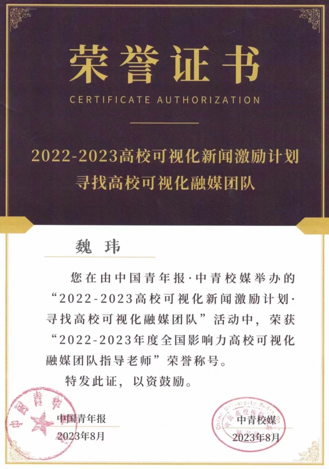 魏玮荣获“2022-2023年度全国影响力高校可视化融媒团队指导老师”荣誉称号