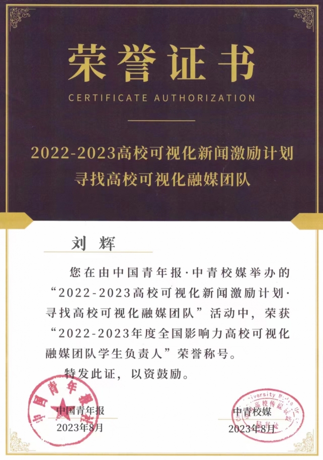 刘辉荣获“2022-2023年度全国影响力高校可视化融媒团队学生负责人”荣誉称号