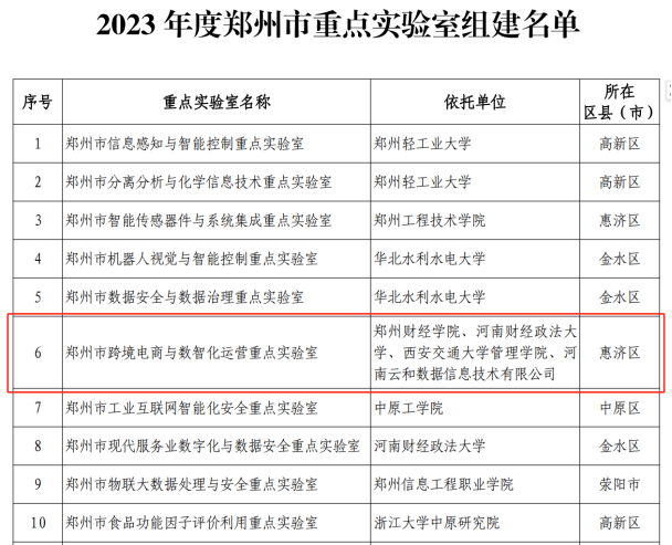 10月20日,郑州市科学技术局下发《关于同意组建2023年度郑州市工程技术研究中心和重点实验室的通知》(郑科〔2023〕43 号)文件,公布2023年度郑州市工程技术研究中心组建名单和2023年度郑州市重点实验室组建名单,beat365申报的郑州市跨境电商与数智化运营重点实验室获批立项建设。