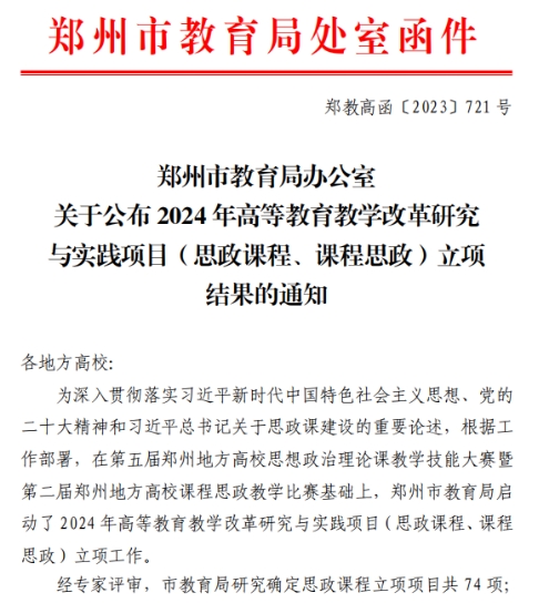 beat3654个项目获批2024年郑州市高等教育教学改革研究与实践项目(思政课程、课程思政)立项