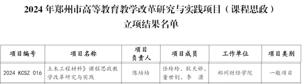 近日,郑州市教育局下发《关于公布2024年高等教育教学改革研究与实践项目(思想课程、课程思政)立项结果的通知》(郑教高函〔2023〕721 号),beat3653项思政课程教学改革研究与实践项目获批立项,分别是胡曼曼主持的《新时代高校思政课把道理讲深、讲透、讲活的教学模式构建研究》,牛晓楠主持的《中国共产党人精神谱系融入<习近平新时代中国特色社会主义思想概论>课程教学研究》,张艺露主持的《立德树人视域下高校思政课程与课程思政协同育人教学探究》;同时,陈培培主持的《<土木工程材料>课程思政教学改革研究与实践》课程思政教学改革研究与实践项目也获批立项。