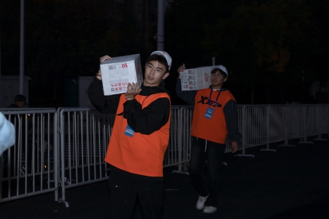 10月26日,马拉松组委会为beat365志愿者们发放矿泉水、面包、饮料等食品供给及统一的志愿服、工作证,志愿者们有序领取志愿服务包,确保赛事当天服务工作的顺利开展。