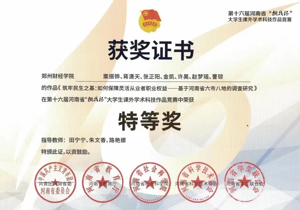 团队以暑期“三下乡”社会实践为依托,成立于2022年,团队成员敏锐关注社会新颖话题,了解到新就业形态下灵活从业者数量不断增加,新就业形态劳资矛盾呈现显性化的趋势。团队成员利用暑期走进河南省5市7地,进行了问卷样本量收集,对我省灵活从业者职业权益保障调研分析数据进行了详实记录。在指导老师的带领下,团队成员积极打磨、修改作品,最终在院级初赛、校级决赛中脱颖而出,项目成功进入河南省预赛阶段。