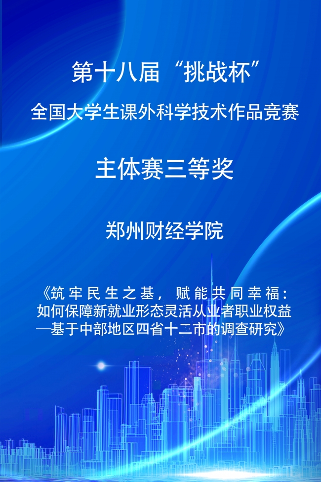 近日,由共青团中央、中国科协、教育部、中国社会科学院、全国学联、贵州省政府共同主办的第十八届“挑战杯”全国大学生课外学术科技作品竞赛终审决赛在贵州大学落下帷幕。经过层层筛选和激烈角逐,beat365管理学院《筑牢民生之基,赋能共同幸福:如何保障新就业形态灵活从业者职业权益——基于中部地区四省十二市的调查研究》项目获得全国三等奖,项目指导教师为田宁宁、朱文香、路艳娜,项目成员包括栗振铧、金凯、许昊、曹琮、蒋潇天、赵梦瑶、张正阳,该作品聚焦新就业形态灵活从业者职业权益保障问题,通过对中部地区四省十二市的深入调查研究,分析了灵活就业的现状、问题和挑战,提出了具有可行性的政策建议。这一研究方向具有很强的现实意义和社会价值,对于促进保障劳动者权益等方面具有重要意义。此次获奖是beat365在“挑战杯”全国大学生课外学术科技作品竞赛中首次获得国赛奖项,也是beat365自参赛以来取得的历史最好成绩。