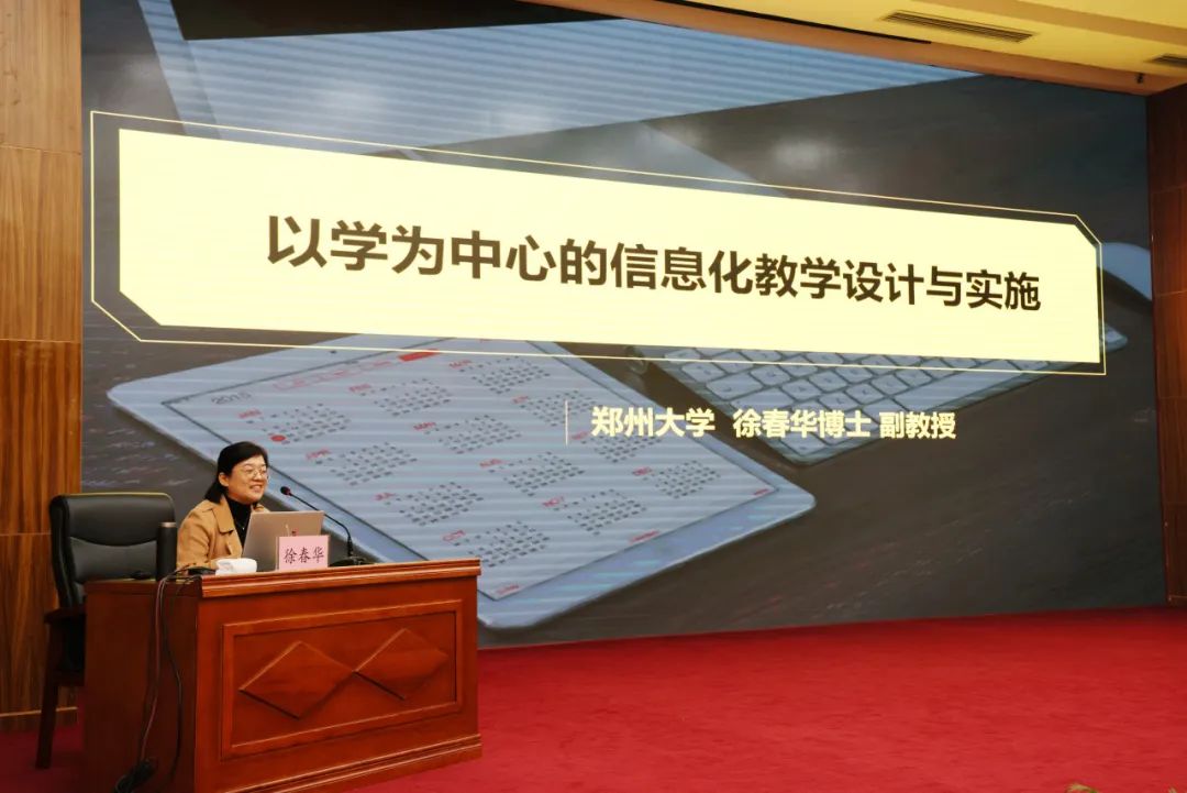 开班仪式结束后,教育技术学博士、郑州大学徐春华副教授以《以学为中心的信息化教学设计与实施》为题作开班报告。她以深厚的理论沉淀和丰富的实践经验,围绕以“学”为中心这个基本点,从课堂改革背景下教师的数字化转型、信息化教学设计的要点和步骤、信息化教学的实践方法等方面,分享了信息化教学的体会。徐博士的报告深入浅出,内容丰富,既注重理论上的解读,又注重结合实际分析,对参训学员教学信息化能力的提升和转型具有很强的指导作用,使其对教学改革有了新的思考。