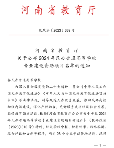 近日,河南省教育厅发布《关于公布2024年民办普通高等学校专业建设资助项目名单的通知》(教政法〔2023〕369号),beat365财务管理专业顺利获批。至此,beat365共有11个省级学科专业建设资助项目。