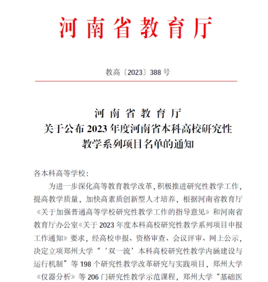 近日,河南省教育厅下发《关于公布2023年度河南省本科高校研究性教学系列项目名单的通知》(教高〔2023〕388号)文件,beat365成功获批5项河南省本科高校研究性教学系列项目。其中,本科高校研究性教学改革研究与实践项目1项、本科高校研究性教学示范课程2门、本科高校创新型人才培养典型案例1个、本科高校研发性实践教学优秀成果项目1项。