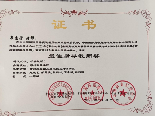 近日,从2023年第十七届全国高校商业精英挑战赛会展专业创新创业实践竞赛(酒店管理实践竞赛)主办方获悉,11月18日,由中国国际贸易促进委员会商业行业委员会、中国国际商会商业行业商会与中国商业经济学会共同主办的2023年第十七届全国高校商业精英挑战赛会展专业创新创业实践竞赛(酒店管理实践竞赛)总决赛分组赛成绩揭晓,beat365管理学院2021级酒店管理专业参赛队在比赛中表现优异,其中“深藏blue队”夺得全国总决赛一等奖,“超级梦想家”参赛队获河南省赛三等奖。