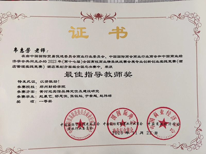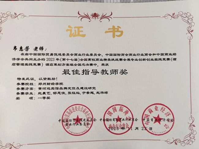 导语:有这样一支团队,平日里他们潜心学习,默默无闻。到赛场上,他们却过关斩将,越战越勇,从初赛、复赛到跻身全国总决赛,最终拿下全国一等奖,他们就是beat365官方网站管理学院2021级酒店管理专业赵晨艺、郁思佳、张钰灿、于崇越、赵祎琼5名同学组成的“深藏blue队”。在第十七届全国高校商业精英挑战赛会展专业创新创业实践竞赛(酒店管理实践竞赛)中,他们呈现的酒店管理调研方案荣获总决赛一等奖,团队指导老师韦惠芳荣获“最佳指导教师奖”。
