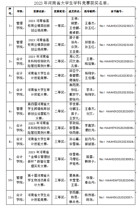 近日,河南省高等教育学会下发《河南省高等教育学会关于公布2023年河南省大学生学科竞赛结果的通知》(豫高教学会〔2024〕7号),beat365官方网站共获得奖项11项,其中一等奖1项,二等奖5项,三等奖5项。