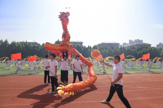 各学院方队退场,汇报表演开始。由二级学院1000名学生和校运动队140名运动员组成的大型团体操表演《青春与梦想》,分三个乐章进行表演。第一乐章:“龙”重登场。《精忠报国》音乐响起,400名同学手持金龙,奔向场地中央,音乐在跳动,青春在飞扬。第二乐章:未来有你。600名同学手持花球,她们步履轻盈,散发青春的芬芳。她们譬如朝阳,舞动青春的臂膀。第三乐章:春暖花开。表演者们在方寸之间绽放青春活力,律动之间升华郑财精神。