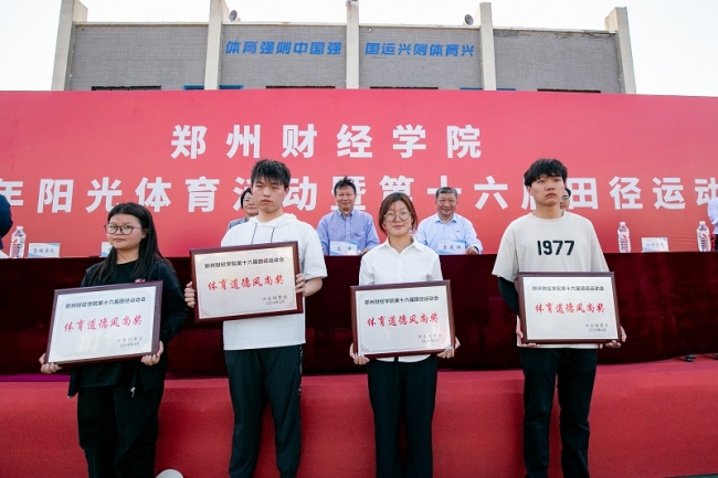 本届运动会总裁判长杨洋宣布竞赛成绩,出席领导为团体奖、优秀组织奖、体育道德风尚奖获奖单位颁发奖牌。