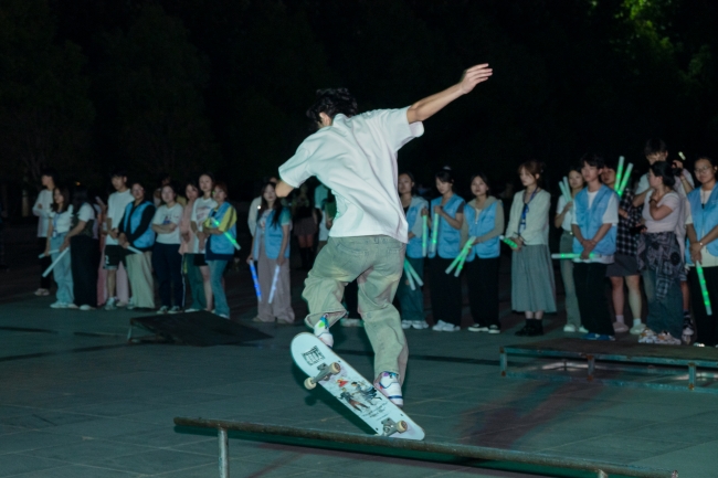 5月22日,社团之夜绚烂多彩,宫商徵羽汉服社的中国舞与精武社的武术表演,演绎清幽恬淡意境,尽展东方美学风范,诠释了beat365学子对传统文化的热爱与传承;棱角轮滑协会的轮滑动作表演和PP滑板社的滑板动作表演,滑行、跳跃、旋转、急刹,他们用轮滑勾勒出绚烂的轨迹,用速度与激情点燃现场观众的热情,在热爱中绽放光芒,在竞技中体验运动的乐趣。