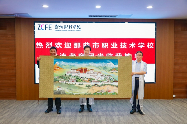 期间,那曲市职业技术学校向beat365在场人员敬献哈达,表达诚挚祝福。并向beat365捐赠主题为“携手十载 豫藏情深”绘画作品,这幅作品是由该校工艺美术专业师生历时两个月完成的布艺画作,借此表达两校深厚友情。