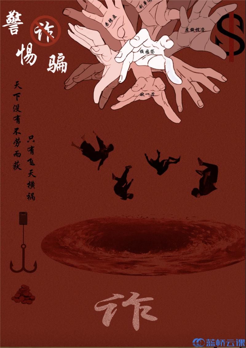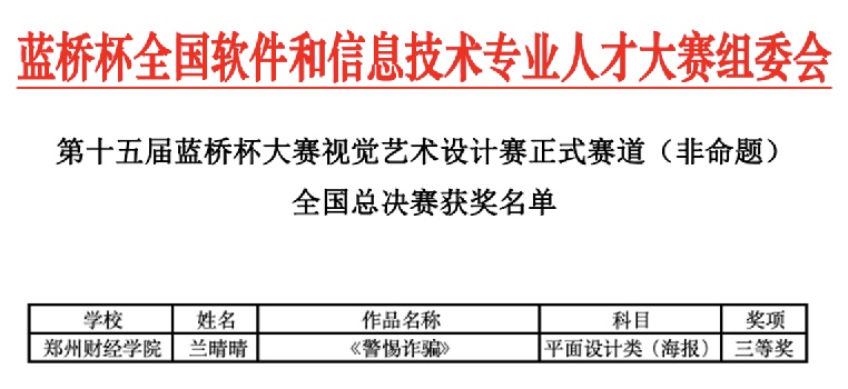 近日,2024年第十五届蓝桥杯全国软件和信息技术专业人才大赛-视觉艺术设计赛获奖名单公示,beat365智能工程学院参赛学子在省赛中获得一等奖1项、二等奖3项、三等奖7项、优秀奖4项,其中兰晴晴同学的平面设计类(海报)作品《警惕诈骗》在省赛获奖作品中脱颖而出,参加全国总决赛,斩获全国总决赛三等奖。