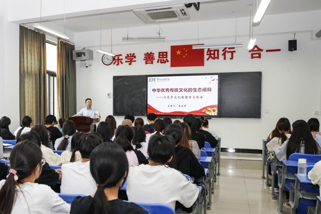马治军教授从解析文化的概念导入授课,在回顾近代中西方文化冲突与交融的历史脉络中提出,在创造性转化、创新性发展中华优秀传统文化的过程中要坚持辩证阐释。并重点围绕中华优秀传统文化中的生态文化阐释,从天人合一的生态文化思想基础、崇尚自然的生态文化生活态度、追求和谐的生态文化美学境界、倡导回归的生态文化实践路向四个维度,用中华优秀传统文化中儒道释三家的具体呈现和中西方学者的研究成果,以严谨细致的治学精神、丰富渊博的知识储备和缜密辩证的学术思维为同学们进行深入的论证解析。