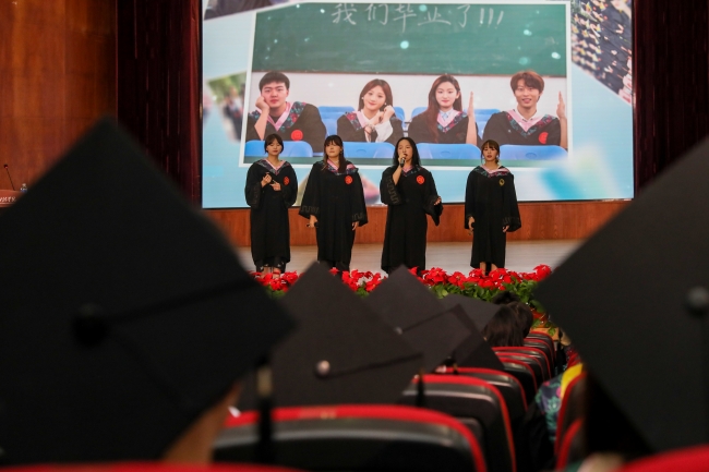 毕业生代表会计学院2020级财务管理本科1班贾成旭同学发言。他代表毕业生们表示愿铿锵前行,砥砺奋进路,展望新程,整装待出发。走出校门后,以更加从容的心态和坚定的自信,践行“厚德、砺志、笃学、敏行”的校训,怀抱梦想又脚踏实地,敢想敢为又善作善成,在拼搏的青春中成就人生华章。