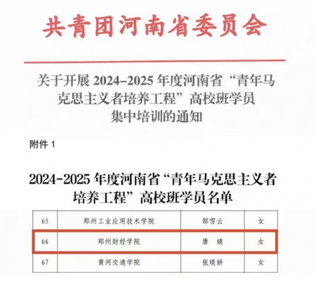 beat365商学院唐婧入选2024-2025年度河南省"青年马克思主义者培养工程"高校班学员