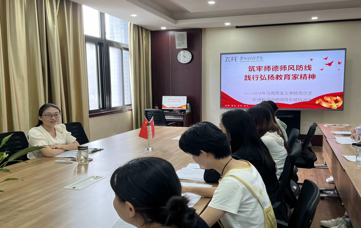 为深入学习贯彻习近平新时代中国特色社会主义思想,落实立德树人根本任务,不断加强师德师风建设,筑牢师德师风防线,规范教师从教言行。8月1日上午,马克思主义学院党总支书记靳会贤在D202会议室为2024年新进教师进行了“筑牢师德师风防线 践行弘扬教育家精神”专题培训会。