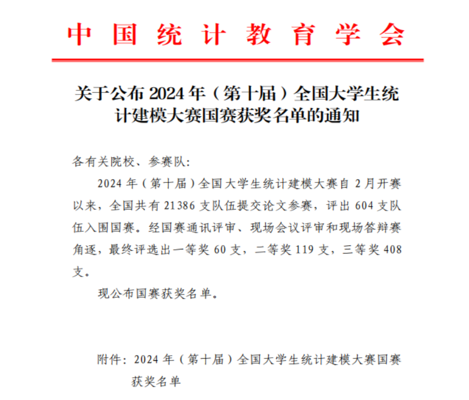 2024年(第十届)全国大学生统计建模大赛国赛获奖名单公布