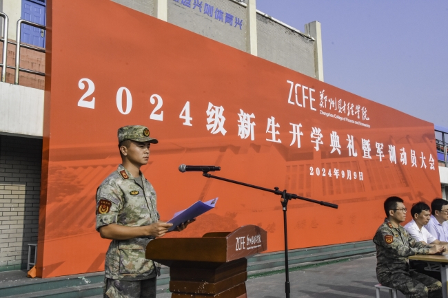 文化与传媒学院2024级网络与新媒体本科1班申芙霞作为新生代表发言,她代表全体新生承诺,在军训中一定会尊重教官,尊重师长,服从命令,听从指挥,向军训的课堂交出一份完美的答卷。并表示在在未来的大学生活中要明确目标、刻苦研习、博采众长、开拓创新。最后表示将用“团结、勤奋、求实、创新”的郑财校风和“乐学善思、知行合一”的郑财学风去书写这段独属于他们的郑财故事。