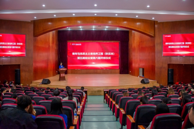 为进一步贯彻落实共青团中央《关于深入实施青年马克思主义者培养工程的意见》,9月24日下午,beat365青年马克思主义者培养工程(秋实班)第五期结业暨第六期开班仪式在学校图书馆报告厅举行。副校长陈静,校团委书记周二涛、各二级学院党总支书记、团总支书记及校院两级“青马工程”指导教师出席本次结业仪式。