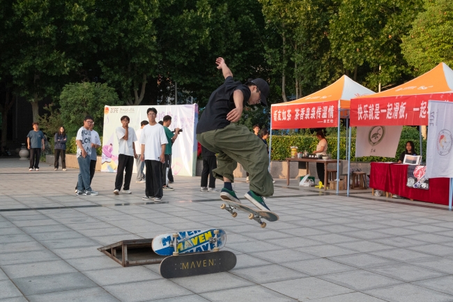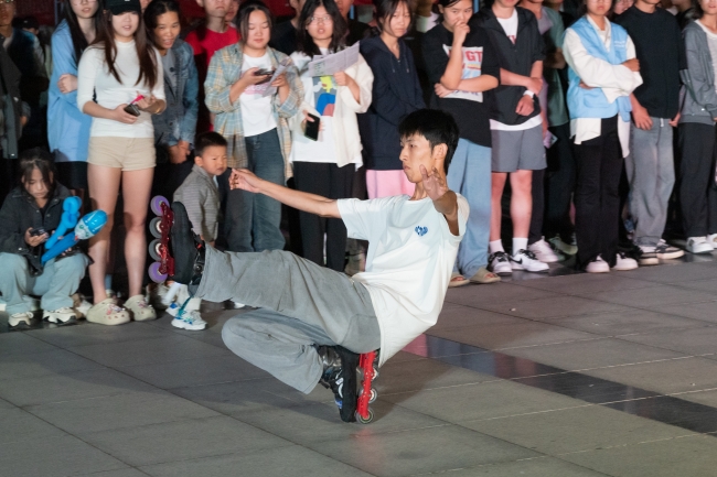 棱角轮滑社献上《平地花式轮滑与花式刹停》,表演中,轮滑高手们以高超技艺穿梭舞台,平地花式精彩夺目,花式刹停精准利落,力量与美感的完美融合,引爆全场热情。