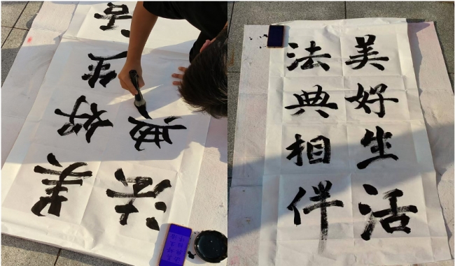 文化与传媒学院组织书法协会创作法治主题作品,旨在通过书法这一传统文化艺术形式,将法治知识融入其中,以提升法治学习的参与性和趣味性。
