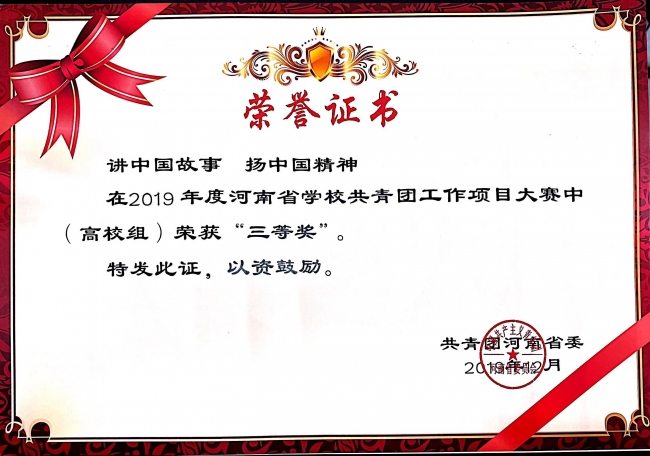 宣讲团自成立以来成绩斐然,先后荣获河南省青年志愿服务项目大赛银奖、河南省“活力杯”共青团工作项目大赛三等奖、全国大学生井冈山精神志愿宣讲优秀团队,“种果青年”中国精神宣讲品牌项目荣获河南省暑期“三下乡”社会实践活动优秀特色品牌项目。