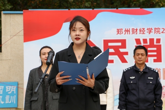 金融学院2022级投资学本科1班赵文慧作为学生代表发言,就消防安全防护,向全校学生发出倡议,从自身做起,从身边小事做起,关注消防,参与消防,共同努力,让消防安全在校园中深深扎根,让火灾远离校园。