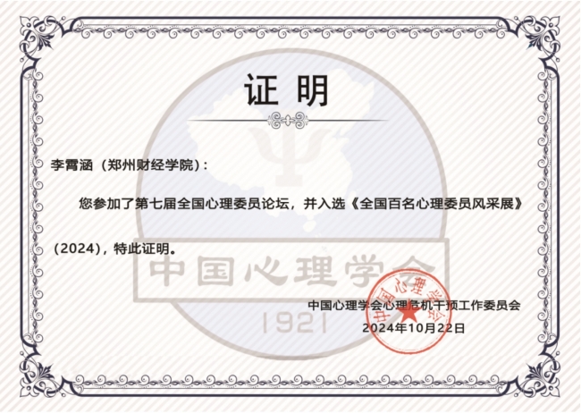 李霄涵入选“全国百名心理委员风采展”