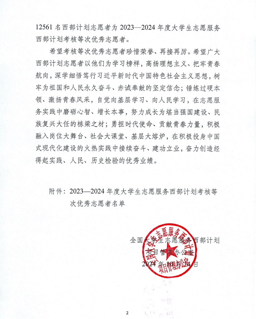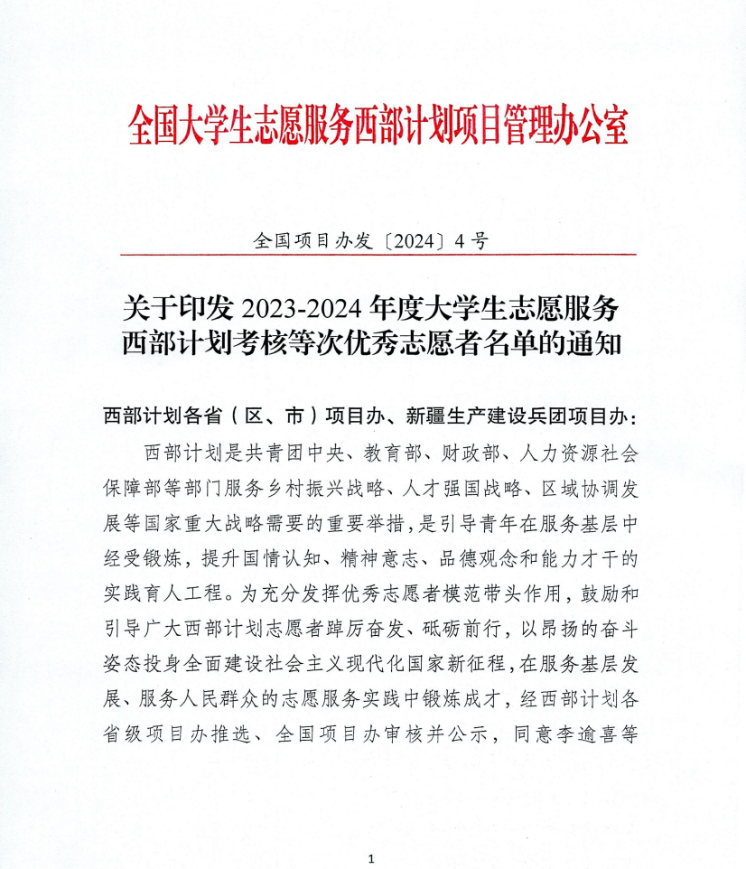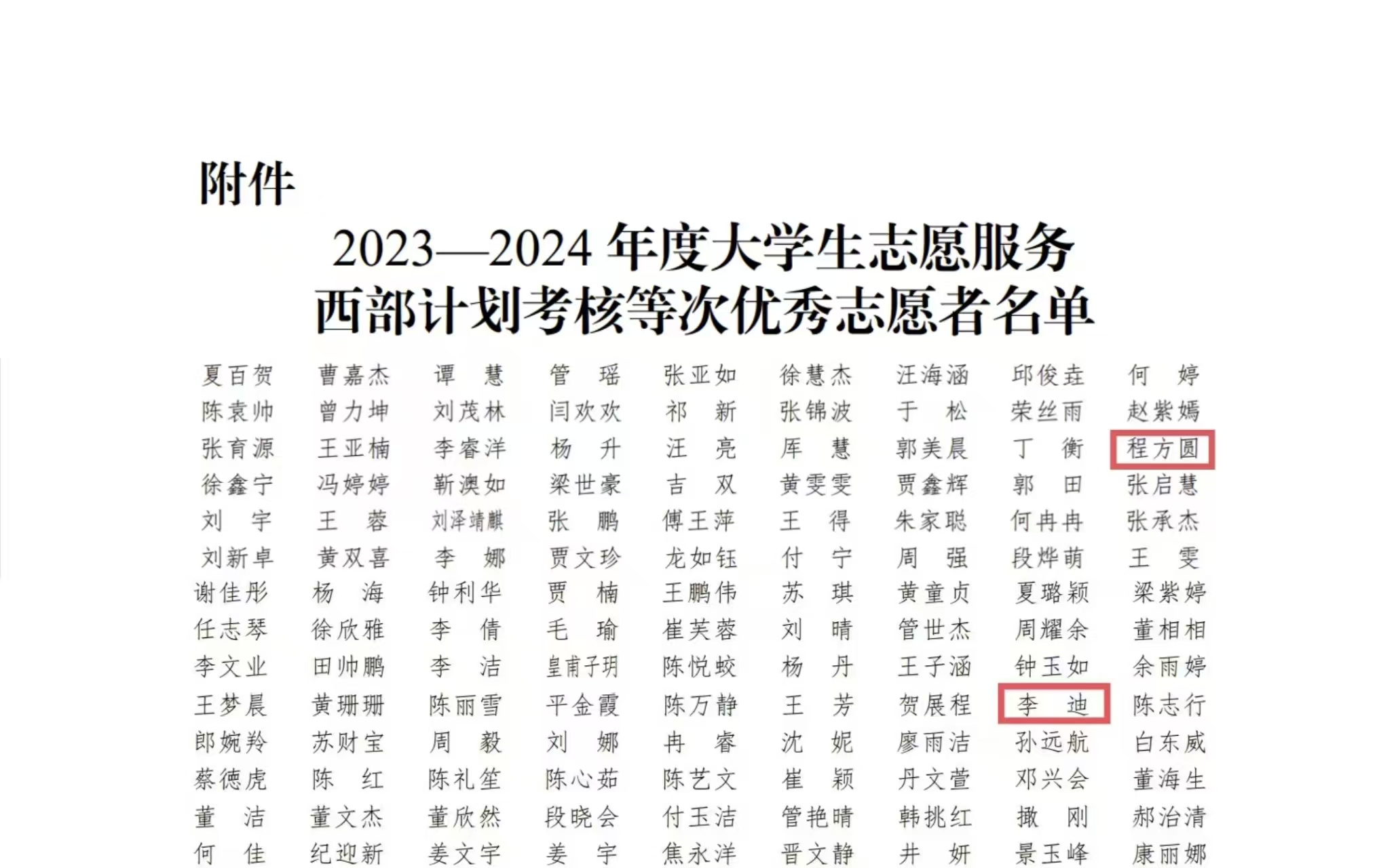 近日,全国大学生志愿服务西部计划项目管理办公室发布《关于印发2023—2024年度大学生志愿服务西部计划考核等次优秀志愿者名单的通知》,beat365李迪、程方圆同学获评全国“2023—2024年度大学生志愿服务西部计划考核等次优秀志愿者”荣誉称号。
