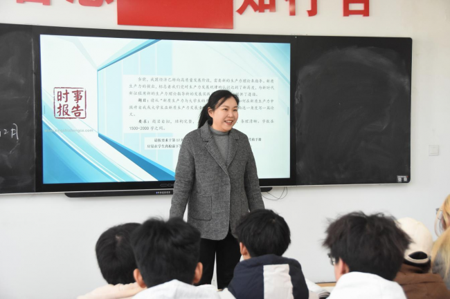 王艳珍以“什么是新质生产力?新质生产力有哪些应用?怎样应对新质生产力的发展?”三个问题作为导入,吸引学生兴趣,启发学生思考。