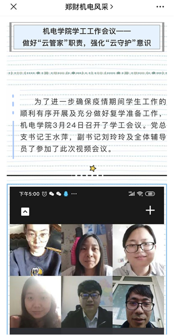 为做好学生“云课堂”的思想引领工作,在开学前2周学院组织各班级召开“收心开学”、“停课不停学”、“居家战疫,云端学习”等主题云班会,辅导员全程主导,引导学生正确认识疫情,科学防疫的同时调整心态,帮助学生挖掘内在动力源,认真上课,努力学习,鼓足劲头不松懈,居家学习有效果。