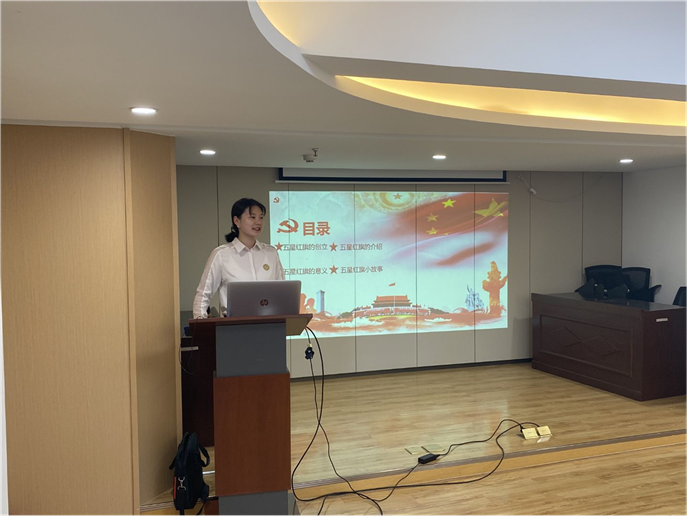 宣讲员田刘娟以五星红旗为中心,宣讲五星红旗的背景及意义,讲述五星红旗的历史故事,带领社区广大党员同志重温红色年代,更加坚定对国旗、国家的热爱。
