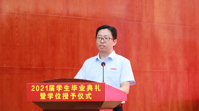 最后,会计学院院长张学功致辞。他向2021届毕业生顺利毕业表示热烈的祝贺,向辛勤培育学生的家长、老师表示诚挚的感谢。张学功对毕业生提出了殷切希望:第一,希望同学们学会感恩,回报社会。感恩父母给予生命、感恩老师培养专业能力。走向社会后,把人生的“盈利点”聚焦在“与国家共荣”上,经营好人生的“资产负债表”;第二,希望同学们诚信为本,坚守底线。诚信立身、诚信处世,做讲诚信的人,成为人生的最大赢家。走上工作岗位后,坚守职业底线,守好做人做事的人生底线;第三,希望同学们终身学习,与时俱进。多学习、勤学习,养成终身学习的良好习惯,为社会、为单位、为家庭多做贡献,不忘初心、砥砺前行。