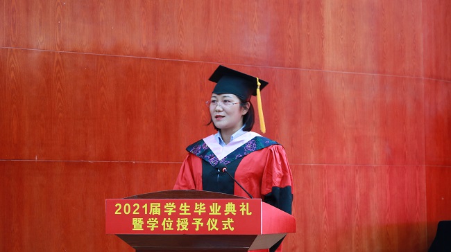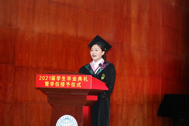 2017级会计学本科3班学生王艳允作为毕业生代表发言。她回顾了大学四年的学习生活,表达了对母校、老师、同学的感恩之情,对母校未来发展送上了诚挚的祝福。