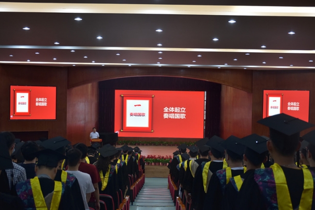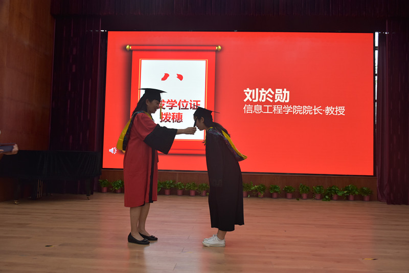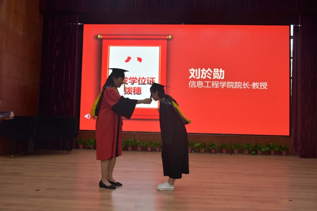 学位授予仪式现场,院长刘於勋为获得学位的毕业生拨穗正冠,与其亲切握手、送上祝福。并逐一为学院毕业生授予学位证书。