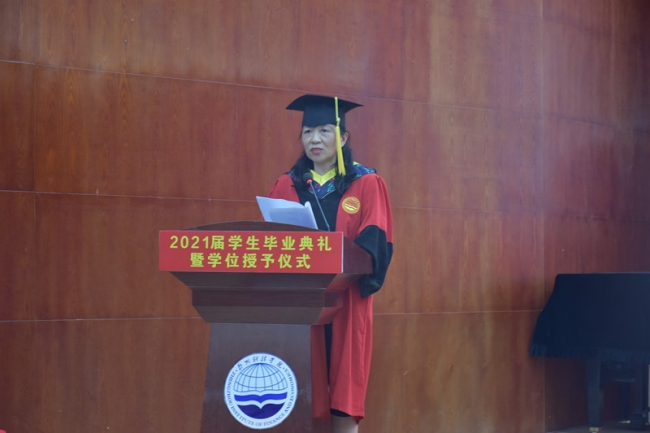 伴随着庄严的国歌声响起,毕业典礼拉开帷幕。学院党总支书记袁雪霞致辞,她代表学院向2021届学生圆满完成学业表示热烈祝贺。她指出,今年是建党100周年,同学们在党的百年华诞这一重要历史时刻完成学业,是与新时代同向同行的幸运一代,意义非同寻常。她勉励毕业生厚植爱党爱国情怀,弘扬艰苦奋斗精神。不忘初心,做一个有理想的追梦人。