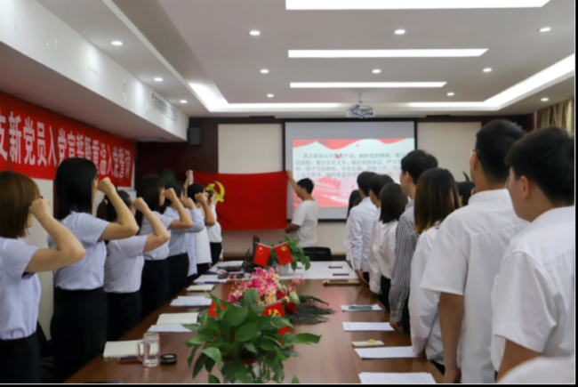 会议伊始,全体肃立,奏唱国歌。铿锵有力的国歌声,拉开了本次入党宣誓仪式的序幕。面对鲜艳的党旗,新党员们举起右手、握拳过肩,在领誓人党总支书记袁清同志的带领下庄严宣誓:“我志愿加入中国共产党,拥护党的纲领,遵守党的章程,履行党员义务,执行党的决定,严守党的纪律,保守党的秘密,对党忠诚,积极工作,为共产主义奋斗终身,随时准备为党和人民牺牲一切,永不叛党”。铮铮誓言表达了对党的忠诚,为共产主义事业奋斗终身的决心。