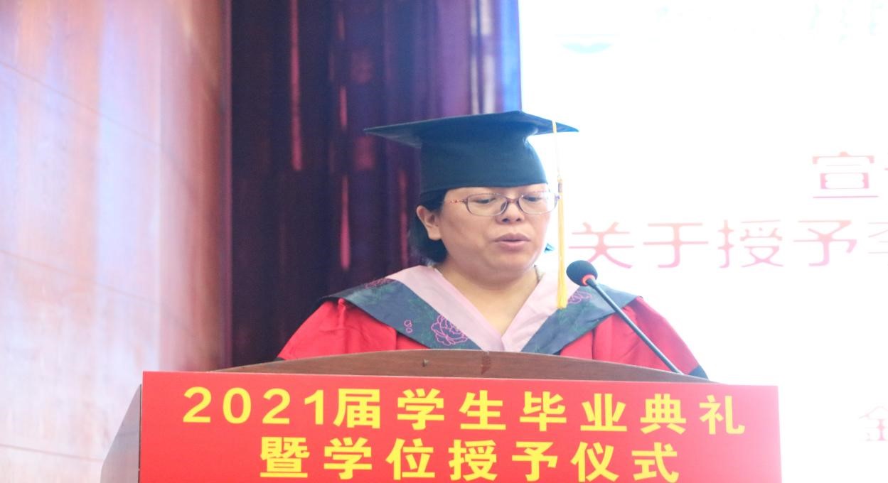 金融学院副院长张丽宣读《关于授予金融学院2021届普通本科毕业生学士学位的决定》