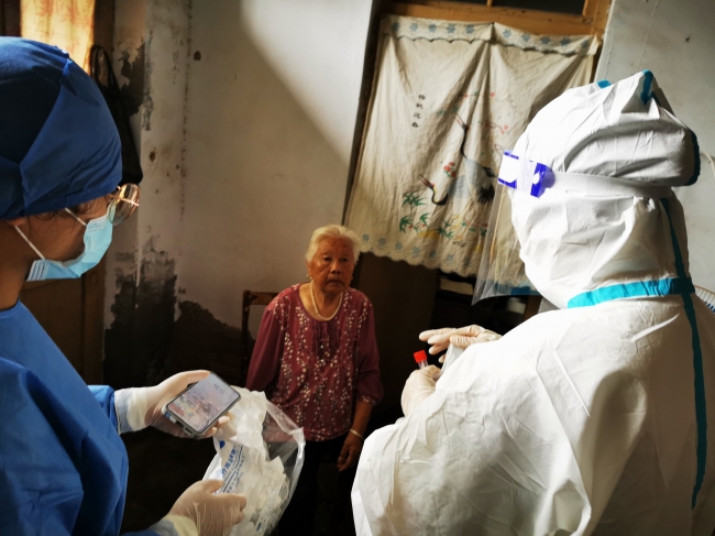 马淑靖协助医务人员为居家隔离人员进行核酸采集