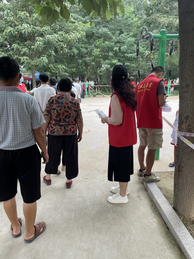 李冰寒,外国语学院18级英语本2班学生,8月10号在河南省新乡市长垣县三娘寨村参与了抗疫志愿服务,主要协助做核酸检测的人员登记信息、维持现场秩序。她说:“在自己的家乡,看着村民在自己的帮助下,一个个有序做完核酸检测,觉得很充实,也理解了医护人员的辛苦。”在现场,她看到一个行动不便的老人即使需要乘坐轮椅,也坚持到场做核酸检测,在帮助这位老人时,老人对她说,“现在国家给了这么好的政策,为的就是在这场疫情中他人心安,自己心安,所以得来”。听了老人的这番话,她很感动,为了抗疫,人人都在尽力。