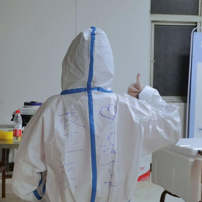 20级物流管理本科2班校亚丽主动加入核酸检测志愿者队伍。她的任务是当医生的助手,身处一线,首先要保护好自己,因此需要穿上防护服。她说:“穿上防护服的那一刻,我深刻体会到了医生的艰辛。在高温环境下,防护服一穿就是一天,无法喝水上厕所。不仅如此,我感觉头晕难受,我只是穿了一次就这么难受,而那些身处一线的抗疫战士不知道要穿多少次。哪有什么岁月静好,只不过有人替我们负重前行。我只是大学生志愿者中的一名,在这场疫情防控中还有很多志愿者和我一样奋斗在一线。坚信在我们的团结、努力下,一定会打赢这场没有硝烟的战争!”