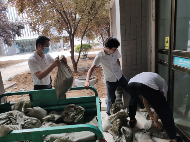 在实验室管理处处长周来的带领下,实验室工作人员对实验楼内外进行了细致排查,对发现的安全隐患安排专人立即整改。并通知实验室假期施工项目单位,采取措施预防次生灾害发生,要按照雨情水情汛情,及时果断地应对或停止各项室外室内相关作业工作。随后,实验室对防汛物资进行了储备准备。目前已对九处重点出入口易进水位置放置了防汛沙袋,构筑了防水屏障。