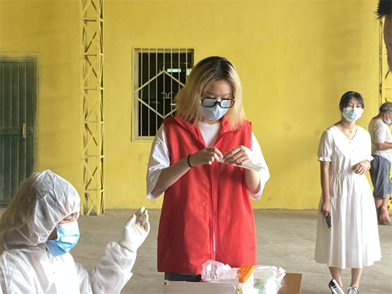 李琪轩,商学院2018级国贸专业本科2班学生,中共预备党员,河南郑州人。 8月12日,她参加了航空港区三官庙乡组织的青年志愿服务队,在村口开展疫情防控卡点的测温扫码工作,并跟随团委组织参加了郑州市第四轮核酸检测志愿者工作,为抗疫工作贡献自己的一份力量。