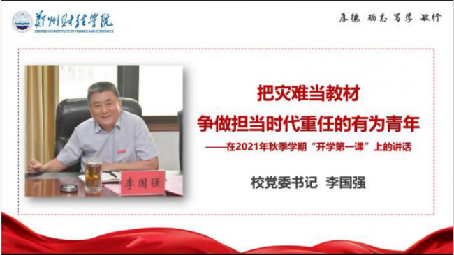 上午9:00,beat3652021年秋季开学第一课正式开讲,学校监事会主席李庆阳主持课程。在嘹亮的国歌声中,管理学院师生在不同场合站立注目鲜艳的五星红旗,同唱国歌参加升旗仪式。随后,学院师生收看了河南省教育厅厅长郑邦山的讲话视频,牢记“把立德树人作为根本任务,用大爱育人心,与中原同崛起;把灾难当教材,与祖国共成长”嘱咐。